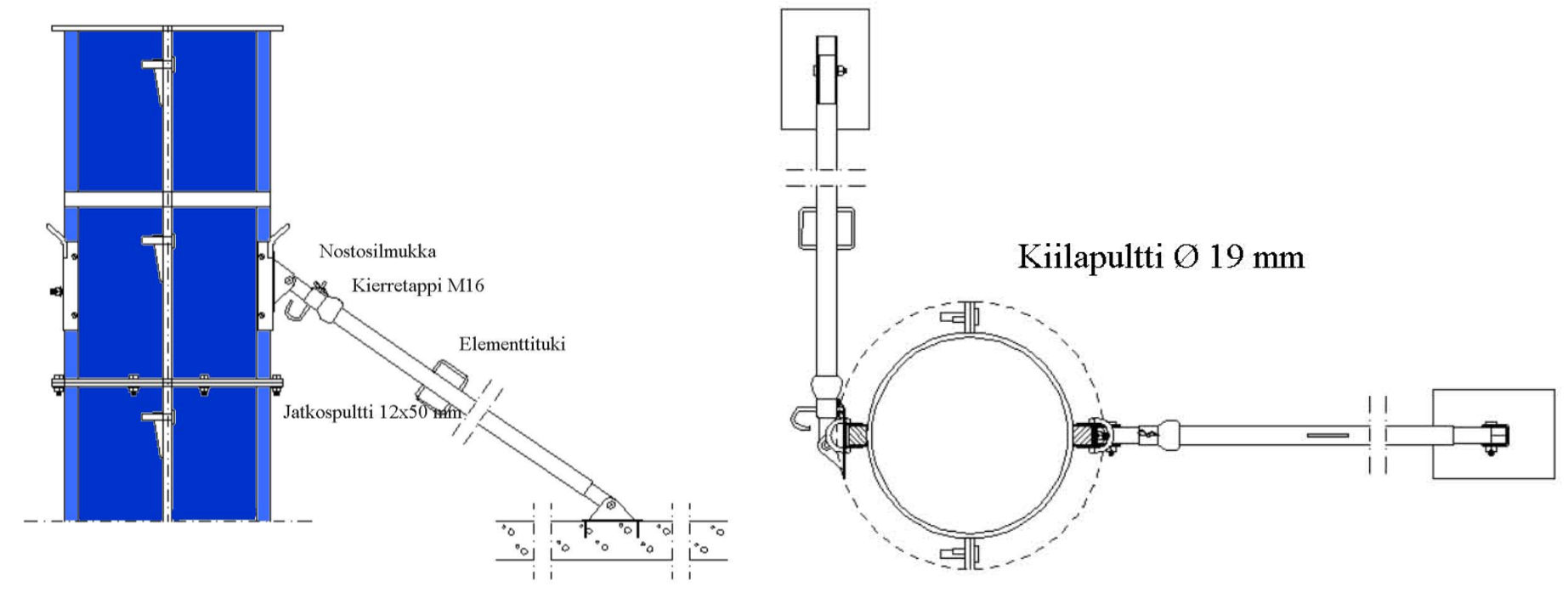 Pilarimuotti tuetaan kahdella elementtituella, jotka asennetaan 90 asteen kulmaan toisiinsa nähden.